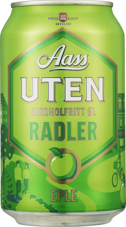 Aass UTEN Radler er alkoholfritt, med smak av eple fra bestemor Smith. Hold kaloriene nede bittelitt, når du skal sykle tur eller sykkelritt. Produktet er 60 % brus og 40 % Aass UTEN Original. Å sette øl til mat handler om å skape balanse mellom ølet og maten. Tenk smak, ikke rett. Aass UTEN Radler passer best til lette og milde smaker. Anbefalt serveringstemperatur er 4-6 grader. Brygget og tappet med lokalt vann, i pantbare bokser av 50 % resirkulert aluminium, og flerforpakning av 70 % resirkulert plast. Aass Brygger er Norges eldste bryggeri, etablert i 1834, og er i dag en moderne industribedrift ledet av 5. generasjon Aass. Vi brygger og tapper alle våre produkter i Norge med visjon om å skape gode stunder."