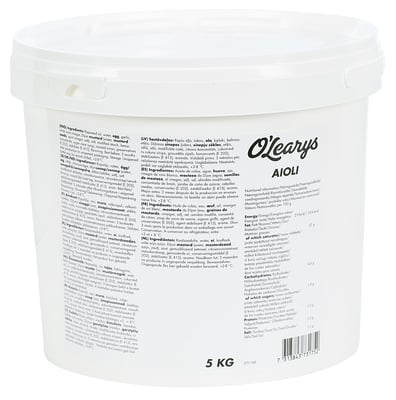 Aioli 5kg O'learys fra O'Learys Vekten er 5000 g. Produktet inneholder følgende allergener: Egg, Sennep. Produktet leveres av REMA 1000 NORGE AS (LEV.). Produktet ble første gang registrert 11.6.2023 og sist oppdatert 6.9.2023.