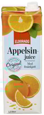 Appelsinjuice m/Fruktkjøtt 1,5l Eldorado fra Eldorado Produktet er tilgjengelig hos Joker til en pris av 26.90 kr. Produktet leveres av Unil as d. Produktet ble første gang registrert 9.1.2022 og sist oppdatert 16.7.2023. Prisen har holdt seg stabil på 26.90 kr.