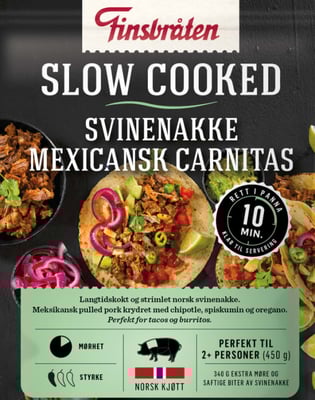 Finsbråten slow cooked pork belly asian sticky er laget av langtidskokt strimlet norsk svineribbe uten bein. Mørt og saftig kjøtt i asiatisk glaze med smak av soya, ingefær og sesam. Perfekt for ekstra gode steam buns, til ris eller i wok.