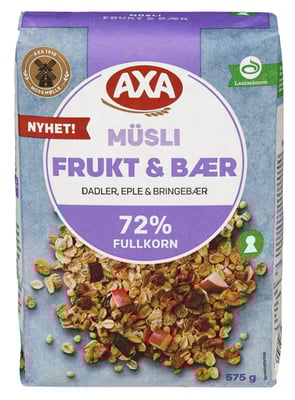 byggflak, tørket eple 2%, bringebær granulat 0,9% (glukose sirup, sukker, bringebær 0,3%,