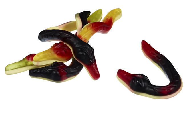 glukosesirup, sukker, gelatine, syre (citronsyre), aromaer, surhedsregulerende middel (trinatriumcitrat), koncentrat fra (saflor, citron/sitron, gulerod/gulrot, solbær, spirulina), kokosolie, farve-/fargestoff (E153), overfladebehandlingsmiddel (carnaubavoks)