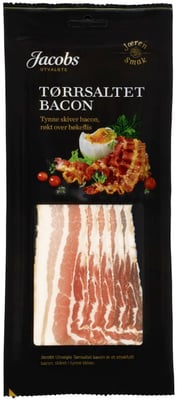 Jacobs Utvalgte Tørrsaltet bacon er et smakfullt bacon, skåret i tynne skiver. Røkt over bøkeflis.