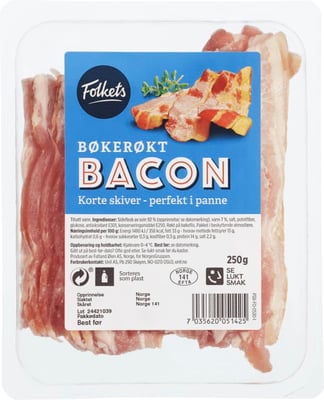 Bacon Bøkerøkt skivet 250g Folkets fra Folkets er et produkt innen Pålegg & frokost, Bacon. Produktet er tilgjengelig hos Meny til en pris av 61.80 kr. Vekten er 250 g. Produktet leveres av Unil. Produktet ble første gang registrert 15.7.2022 og sist oppdatert 4.10.2023. Prisen har endret seg fra 63.30 kr til 61.80 kr over tid.