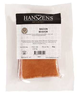Bacon m/Svor i Bit Hanssens fra Hanssens Vekten er 0.4 kg. Produktet leveres av H A HANSSEN A/S. Produktet ble første gang registrert 11.6.2023 og sist oppdatert 6.9.2023.