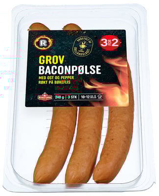 Svinekjøtt * (74 %), vann, småflesk av svin*, bacon (13 %) (sideflesk av svin* uten ben og svor, vann, salt, dekstrose, stabilisator (trifosfat), antioksidant (natriumaskorbat) og konserverigsmiddel (natriumnitritt)), ost (5 %) Jarlsberg (pasteurisert melk, syrekultur, salt, potetmel, mikrobiell løpe), Norvegia (pasteurisert melk, syrekultur, salt, potetmel, mikrobiell løpe og surhetsregulerende middel (kalsiumklorid)), dekstrose, krydder (muskat, paprika, chili, koriander og sort pepper), animalsk protein (svin), buljong (salt, gjærekstrakt, maltodekstrin, (mais), sukker, løk og løpstikke), stabilisator (trifosfat), vegetabilsk fiber (sitrus) og konserveringsmiddel (natriumnitritt). Importert fåretarm