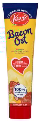Kavli BaconOst er ett av Norges mest populære ostepålegg. Den er laget av ekte, norsk hvitost og baconbiter som gjør den rik på kalsium og protein. Osten holder seg godt i og utenfor kjøleskap, og tuben gjør det enkelt å smøre skiven. Del med glede - Kavli deler ut hele overskuddet til gode formål! NB: Den tomme tuben resirkuleres som glass- og metall, trenger ikke å vaskes.