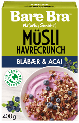 Bare Bra Blåbær & Acai 400g fra BARE BRA Produktet er tilgjengelig hos Coop til en pris av 41.90 kr. Produktet leveres av ORKLA FOODS NORGE AS (STABBURET). Produktet ble første gang registrert 9.1.2022 og sist oppdatert 16.7.2023. Prisen har holdt seg stabil på 41.90 kr.