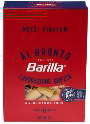 Barilla Pasta Mezzi Rigatoni Al Bronzo 400g fra Barilla Vekten er 400 g. Produktet inneholder følgende allergener: Gluten. Produktet leveres av BARILLA NORGE AS. Produktet ble første gang registrert 11.6.2023 og sist oppdatert 6.9.2023.