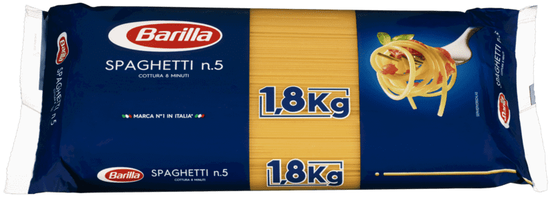 Barilla Spaghetti no.5 1,8kg fra BARILLA Produktet er tilgjengelig hos Coop til en pris av 48.90 kr. Produktet leveres av BARILLA NORGE AS. Produktet ble første gang registrert 9.1.2022 og sist oppdatert 16.7.2023. Prisen har holdt seg stabil på 48.90 kr.