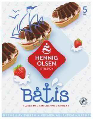 Båtis er klassisk fløteis med vaniljesmak i kjeksbeger med jordbærsyltetøy og sjokoladeovertrekk. En ekte skjærgårds-is fra Hennig-Olsen Is.
