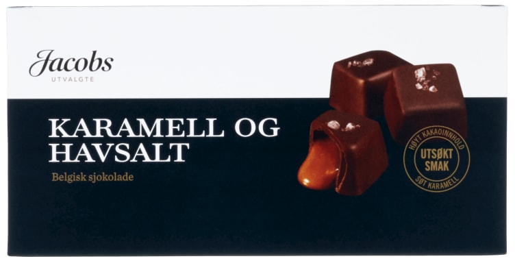 Jacobs Utvalgte belgisk konfekt er fylt med søt karamell og toppet med et lite dryss havsalt.