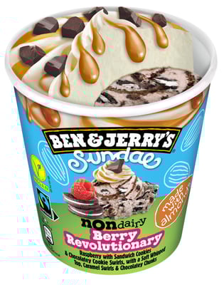 Ben & Jerry's Berry Revolutionary er en bringebæris uten melkeprodukter med sjokoladekjeksvirvler og sjokoladesandwichkjeks, toppet med kremaktig iskrem, sjokoladefudgesaus og sjokoladebiter