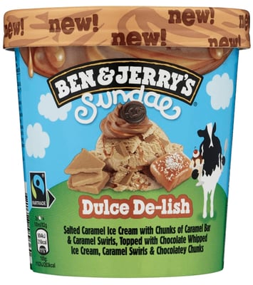 Ben & Jerry's Sundae Dulce De-lish er en Salt karamalliskrem med biter av karamell og karamellsaus, toppet med kremet sjokoladeis, karamellsaus og sjokoladebiter.
