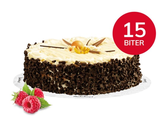 Fløtekrem (fløte, sukker, glukosesirup, invertsukkersirup, vann, stabilisator (e450, e339)), vaniljekrem (vann, sukker, kjernemelkpulver, kokosfett, modifisert maisstivelse (e1442), konserveringsmiddel (e202), salt, vaniljearoma, farge (e160a, e101)), sukkerbunn (hvetemel, sukker, egg, hvetestivelse, vann, skummetmelkpulver, hvetegluten, stabilisator (e422, e341), emulgator (e472b, e475, e481), hevemiddel (e450, e500, e503), salt, farge (e101), aroma (vanillin), fortykningsmiddel (e461, e407, e410, e412), modifisert stivelse (e1422), maltodekstrin, surhetsregulerende middel (e330)), bringebærsyltetøy (sukker, bringebær (40 %), vann, fortykningsmiddel (e440), surhetsregulerende middel (e330), konserveringsmiddel (e202)), pynt (sukker, kakaomasse, -smør og -pulver, melkepulver, laktose, vann, veg. olje (raps, palme, palmekjerne, kokos), smørolje (m/ melk ), hvetegluten, aroma (vanilje), mais- og tapiokastivelse, glukose, ekstrakt (gulrot, spinat, spirulina, carthamus), salt, rismel, mysepulver, melkeprotein, glyserol, maltmel av hvete, konsistensmiddel (e401, e406, e412, e413, e414, e415, e422, e440, e450, e466, e472c, e476, e555, e901, e904, e322- soya /solsikke), farge (e100, e101, e120, e131, e132, e133, e141, e150d, e151, e153, e155, e160ac, e161b, e162, e163, e170, e171, e172, e173), kons. middel (e200, e202, e211, e218), surhetsreg. middel (e300, e330, e331, e524), drivgass (e943, e944)). inneholder en eller flere typer sukker samt søtstoffer.