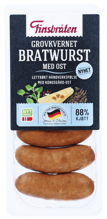 Finsbråten tar spesialpølser til et nytt nivå med denne grovkvernede pølsen. Den har høyt kjøttinnhold, fast og fin konsistens, saftig bitt, og massevis av skikkelig god smak». Bratwurst Med Ost er en røkt pølse av svinekjøtt med høy kvalitet. Den inneholder utvalgte krydder og urter som fremhever de gode smakene i en klassisk Bratwurst, men med en vri - Kongsgård-Ost fra Synnøve som gjør den ekstra saftig og smakfull.