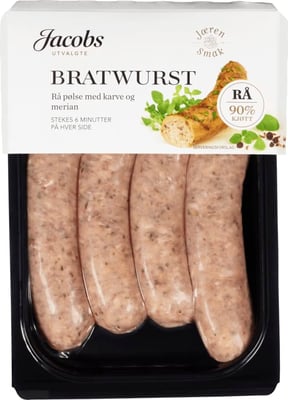 Jacobs Utvalgte Bratwurst er en rå, tyskinspirert pølse med karve og merian. Pølsene fra Jacobs Utvalgte er alt fra smakfulle, rå pølser, bratwurst og salsiccia til mer tradisjonelle ostepølser - alle laget med kvalitetsråvarer og en svært høy kjøttandel.