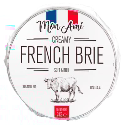 Brie Mon Ami 3 kg Helvekt fra Mon Ami Vekten er 3000 g. Produktet inneholder følgende allergener: Melk. Produktet leveres av FOODBROKER AS. Produktet ble første gang registrert 11.6.2023 og sist oppdatert 6.9.2023.