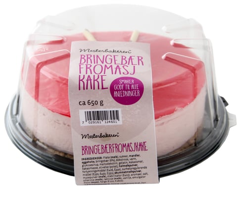 Fløte (37 %), mandelbunn (14 %) (melis, mandelmel (25 %), eggehvite, mandler (13 %), bringebærfyll (14 %) (bringebær (57 %), sukker, vann, modifisert stivelse, sitronjuicekonsentrat, , naturlig aroma, hyllebærjuicekonsentrat, surhetsregulerendemiddel (E330), vann (8%), glasur (8%) (glukosesirup, vann, sukker, geleringsmiddel (E440, E415), surhetsregulerendemiddel (E330, E332), konserveringsmiddel (E202)), sukker (7 %), bringebærfyll (7%) (bringebærpure (50 %), sukker, vann, glukose-fruktosesirup, fortykningsmiddel (E440, E410, E412), naturlig bringebæraroma med andre naturlige aromaer), sjokolade (1 %) (sukker, kakaomasse, kakaosmør, helmelkpulver, laktose (melk), smørolje (melk), emulgator (E322 soya), naturlig vanilje aroma)), gelatin (storfe), modifisert maisstivelse, farge (hyllebærjuicekonsentrat), surhetsregulerendemiddel (E330), naturlig bringebæraroma.