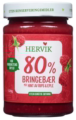 Naturlig lett syltetøy med signatursmaken til Hervik med søte bringebær og syrlige friske rips for en balansert smak. Inneholder 80 % bær og mindre sukker. Hervik syltetøy inneholder mye frukt og ingen konserveringsmidler. På denne måten får du mye av de gode og naturlige råvarene uten at uønskede konserveringsmidler følger med. Dette forklarer også den naturlig gode smaken.