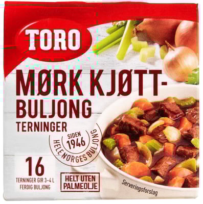 Buljongterning 16stk Toro fra Toro er et produkt innen Middagstilbehør, Kraft og buljong, Buljong. Produktet er tilgjengelig hos Joker til en pris av 49.90 kr. Vekten er 64 g. Produktet inneholder følgende allergener: Selleri, Soya. Produktet leveres av Orkla foods norge as. Produktet ble første gang registrert 9.1.2022 og sist oppdatert 6.10.2023. Prisen har holdt seg stabil på 49.90 kr.