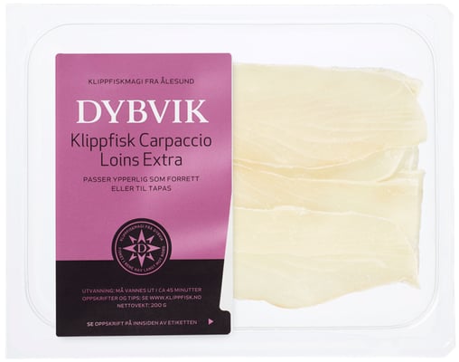 Carpaccio Klippfisk Loinsextra Dybvik fra Dybvik Vekten er 1 kg. Produktet inneholder følgende allergener: Fisk. Produktet leveres av JAKOB OG JOHAN DYBVIK AS. Produktet ble første gang registrert 11.6.2023 og sist oppdatert 6.9.2023.