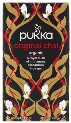 Pukka Original Chai er en svart te med varmende urter - en blanding av fem organiske urter fra små uavhengige bønder rundt om i verden. Pukkas Chai inneholder varm kanel og ingefær. en deilig aromatisk kardemomme og en søt og beroligende lakris
