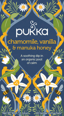 Pukka Chamomile Vanilla Honey Urte-te 20ps er en beroligende økologisk kamille-te med søt smak av vanilje og manukahonning. Dette er teen for deg som ønsker mer ro i koppen. 100% økologisk