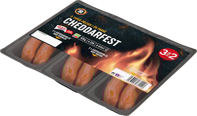 Kjøtt av svin og storfe (75 %), vann, cheddarost: (melk, salt, farge E160b) (7 %), bacon: (sideflesk av svin, vann, salt, dekstrose, røykaroma, stabilisator E450, E451,antioksidant E316, konserveringsmiddel E250, E262) (7%), potetmel, salt, krydder, dekstrose, surhetsregulerende middel E508, gjærekstrakt, hydrolysert vegetabilsk protein (mais, soya), stabilisator E451, antioksidant E315, konserveringsmiddel E261, E326, E250. Røkt med bøkeflis. Importert fåretarm.Prosesseringsanalyse
