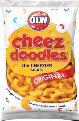 Cheez Doodles 35g Olw fra Olw er et produkt innen Snacks & godteri, Snacks, Ostesnacks. Produktet er tilgjengelig hos Meny til en pris av 24.50 kr. Vekten er 36 g. Produktet inneholder følgende allergener: Melk. Produktet leveres av Orkla confectionery & snacks norge as. Produktet ble første gang registrert 10.1.2022 og sist oppdatert 7.10.2023. Prisen har holdt seg stabil på 24.50 kr.