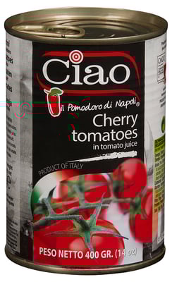 Cherrytomater 400g Ciao fra Ciao Vekten er 400 g. Produktet leveres av OLUF LORENTZEN AS. Produktet ble første gang registrert 11.6.2023 og sist oppdatert 6.9.2023.
