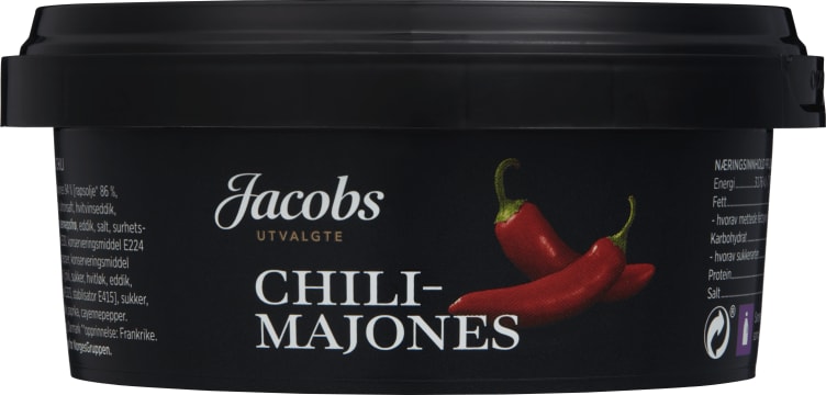 Chilimajones 150g Jacobs Utvalgte fra Jacobs utvalgte er et produkt innen Pålegg & frokost, Majones. Produktet er tilgjengelig hos SPAR til en pris av 26.90 kr. Vekten er 150 g. Produktet inneholder følgende allergener: Egg, Sennep, Sulfitt. Produktet leveres av Unil. Produktet ble første gang registrert 9.1.2022 og sist oppdatert 6.9.2023. Prisen har holdt seg stabil på 26.90 kr.