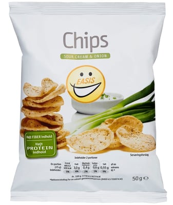 Sprø chips med nydelig Sour cream and onion-smak. Chipsene har et høyt proteininnhold og 60% mindre fett enn tradisjonelle chips.