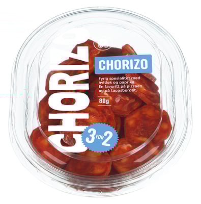 Chorizo 80g R fra R Vekten er 80 g. Produktet leveres av REMA 1000 NORGE AS (LEV.). Produktet ble første gang registrert 11.6.2023 og sist oppdatert 6.9.2023.