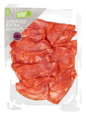 Chorizo Extra 40g Ridderheims fra Ridderheims er et produkt innen Pålegg & frokost, Kjøttpålegg, Saltpølser. Produktet er tilgjengelig hos Meny til en pris av 48.30 kr. Produktet inneholder følgende allergener: Melk, Soya. Produktet leveres av Oluf lorentzen as. Produktet ble første gang registrert 9.1.2022 og sist oppdatert 3.8.2023. Prisen har holdt seg stabil på 48.30 kr.