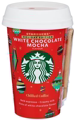 Christmas Coffee White Choc.Mocca 220ml Starbucks fra Starbucks Produktet er tilgjengelig hos SPAR til en pris av 24.50 kr. Produktet leveres av Arla foods as. Produktet ble første gang registrert 9.1.2022 og sist oppdatert 16.7.2023. Prisen har holdt seg stabil på 24.50 kr.