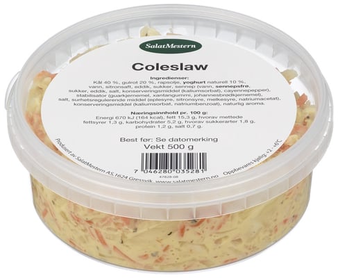 Coleslaw 500g Sm fra Sm Vekten er 500 g. Produktet inneholder følgende allergener: Melk, Sennep. Produktet leveres av SALATMESTERN AS. Produktet ble første gang registrert 11.6.2023 og sist oppdatert 6.9.2023.