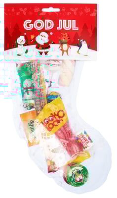 Sukker, glukosesirup, dextrose, glukose-fruktosesirup, gelatin, vegetabilske oljer (palmeolje, palmekjerneolje, kokos), modifisert stivelse, maisstivelse, surhetsregulerende midler (melkesyre, sitronsyre, eplesyre, natriumbikarbonat) emulgator (E322, E471, E435, glyserol monostearate), modifisert stivelse, sorbitol, HELMELKSPULVER, kakaomasse, kakaosmør, MYSEPULVER, hydrolysert SOYAPROTEIN, aroma, naturlig vaniljearoma, stearinsyre, antiklumpemiddel (magnesiumkarbonat, magnesiumstearat, maisstivelse), maltodextrin, natriumhydrogenkarbonat, fargestoff (E100, E120, E133, E150c, E141, ammonisert karamell, antocyanin, klorofyllin-kobberkompleks, rødbete, kurkumin, paprika, lutein, beta karoten), antioxidationsmiddel (E307), søtningsmiddel E950, HVETEMEL, konsentrater (tomat, eple, gresskar, reddik), antioksidanter (tokoferoler, askorbinsyre), blandet fruktpure (eple, kirsebær, bringebær, ananas, lime, sitron, fersken, banan, appelsin, blåbær, bjørnebær, mango, vannmelon, kiwi) (1.9)