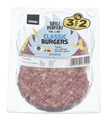 Coop Classic Burgers 300g fra COOP Produktet er tilgjengelig hos Coop til en pris av 47.90 kr. Produktet leveres av FATLAND SALG AS. Produktet ble første gang registrert 9.1.2022 og sist oppdatert 16.7.2023. Prisen har holdt seg stabil på 47.90 kr.