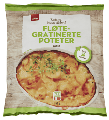 Coop Fløtegratinerte Poteter 750g fra COOP Produktet er tilgjengelig hos Coop til en pris av 49.90 kr. Produktet inneholder følgende allergener: Melk. Produktet leveres av FINDUS NORGE AS. Produktet ble første gang registrert 9.1.2022 og sist oppdatert 16.7.2023. Prisen har holdt seg stabil på 49.90 kr.