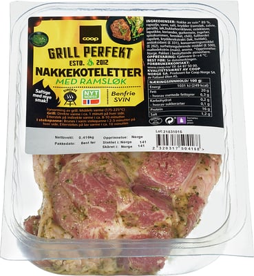 Nakke av svin 89 %, rapsolje, vann, salt, krydder (ramsløk, salvie, persille, løk, bukkehornkløver, ostekløver, løpstikke, koriander, gurkemeie, ingefær, spisskummen, fennikel, chili), fullherdet rapsfett, krydderekstrakt (løk, hvitløk), antioksidant (E 331), konserveringsmiddel (E 262), surhetsregulrende middel (E 500), maltodekstrin (mais), aroma.