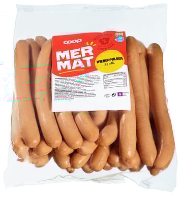 Kjøtt 60 % (svin 44 %, storfe 16 %), vann, vegetabilsk stivelse (tapioka, potet), konserveringsmiddel (E 326, E 262, E 250), glukose (mais), svineprotein, salt, vegetabilsk fiber (potet, gulrot, bambus), krydder (muskat, sort pepper, hvit