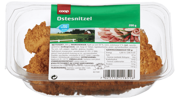 Coop Ostesnitzel 200g fra COOP Produktet er tilgjengelig hos Coop til en pris av 15.90 kr. Produktet inneholder følgende allergener: Melk. Produktet leveres av FATLAND SALG AS. Produktet ble første gang registrert 15.7.2022 og sist oppdatert 16.7.2023. Prisen har holdt seg stabil på 15.90 kr.
