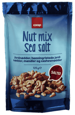 Coop Salt Nøttemix 125g fra COOP Produktet er tilgjengelig hos Coop til en pris av 21.50 kr. Produktet leveres av INTERSNACK NEDERLAND BV. Produktet ble første gang registrert 9.1.2022 og sist oppdatert 16.7.2023. Prisen har holdt seg stabil på 21.50 kr.