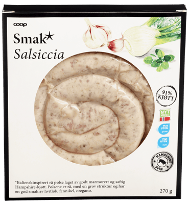 Coop Smak Rå Salsicha Spiral 270g fra SMAK Produktet er tilgjengelig hos Coop til en pris av 51.90 kr. Produktet leveres av FATLAND SALG AS. Produktet ble første gang registrert 9.1.2022 og sist oppdatert 16.7.2023. Prisen har holdt seg stabil på 51.90 kr.