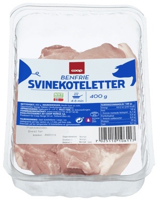 Coop Svinekoteletter uten Ben 400g fra COOP Produktet er tilgjengelig hos Coop til en pris av 64.90 kr. Produktet leveres av FATLAND SALG AS. Produktet ble første gang registrert 9.1.2022 og sist oppdatert 16.7.2023. Prisen har holdt seg stabil på 64.90 kr.