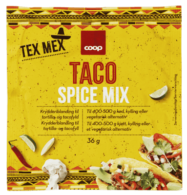 Coop Taco Spicemix 36g fra COOP Produktet er tilgjengelig hos Coop til en pris av 2.50 kr. Produktet leveres av MERSCHBROCK-WIESE GEWURZ GMBH. Produktet ble første gang registrert 9.1.2022 og sist oppdatert 16.7.2023. Prisen har holdt seg stabil på 2.50 kr.