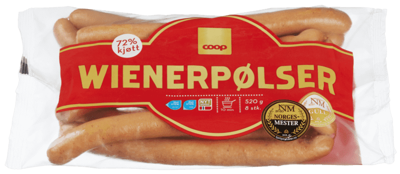Coop Wienerpølse 520g fra COOP Produktet er tilgjengelig hos Coop til en pris av 59.90 kr. Produktet leveres av FATLAND SALG AS. Produktet ble første gang registrert 9.1.2022 og sist oppdatert 16.7.2023. Prisen har holdt seg stabil på 59.90 kr.