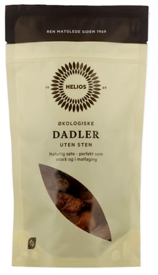 Helios Dadler er økologiske, uten stein og består av 100% frukt - ingenting annet. De får sin gode, søte smak etter å ha tørket i solen og er rike på kostfiber og kalium. De er gode å nyte alene, men kan også brukes som naturlig søtning i smoothie, kaker og energibarer.