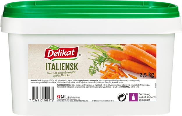 Delikat Italiensk Salat 2.5kg fra Delikat Vekten er 2500 g. Produktet inneholder følgende allergener: Egg, Sennep. Produktet leveres av MILLS AS. Produktet ble første gang registrert 11.6.2023 og sist oppdatert 6.9.2023.